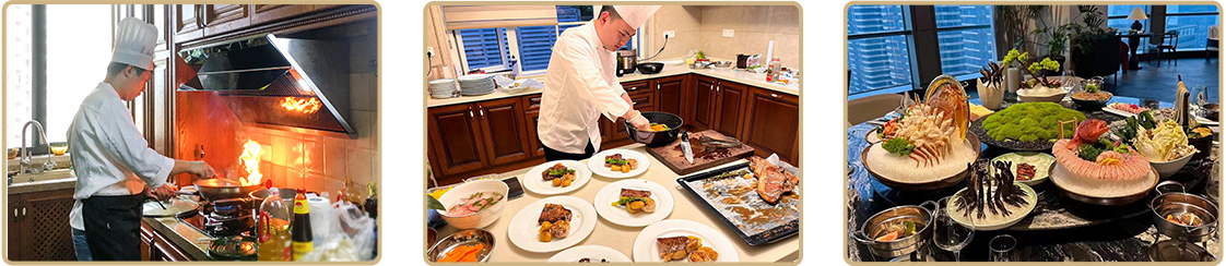 全流程托管: 从前期策划、食材采购、现场烹饪、专业服务,到餐后的深度清洁,我们实现全链条覆盖。宴席结束后,您的家将恢复如初,甚至比之前更具格调。